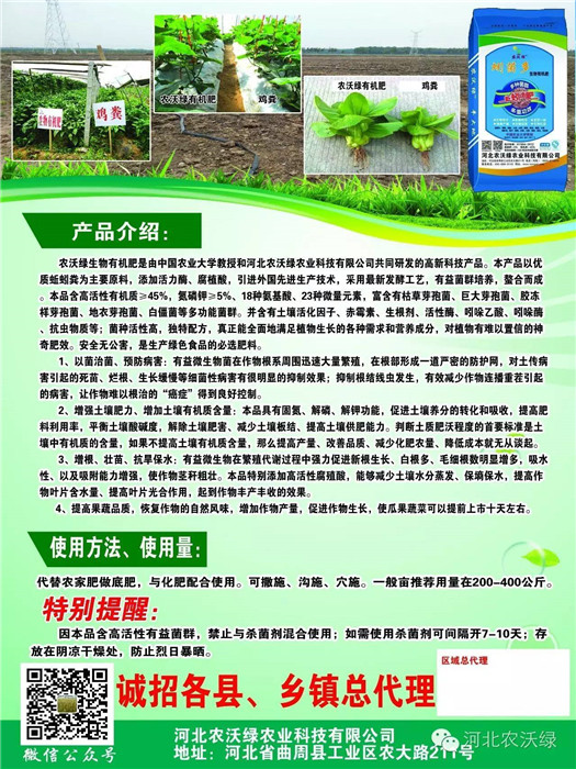 農沃綠生物有機肥含高活性有機質≥45%,氮磷鉀含量≥5%,添加活力酶、腐植酸,18種氨基酸和鈣、鎂、硫、錳、硼、鋅、鐵等23種中微量元素,有效活菌數5億/克。